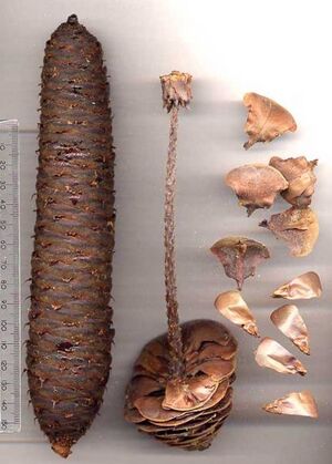 Cylindrical cones 5-25 cm (2-10 in) long shatter at maturity to release the winged seeds, leaving a spiky stalk.