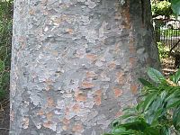 The bark is smooth and light grey to grey-brown usually peeling into irregular flakes that become thicker on more mature trees. The branch structure is often horizontal or when larger, becoming more ascending. The lowest branches often leave circular branch scars as they fall off from the lower trunk.