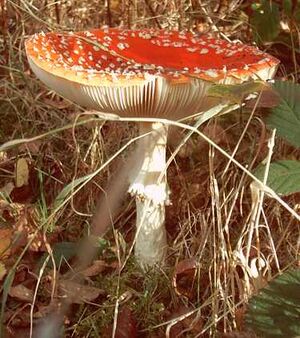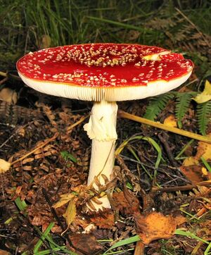 Template:Mycomorphbox Amanita muscaria (also known by the English-language common name fly agaric) is a psychoactive agaric species found commonly throughout much of the world. The quintessential toadstool, it is a large imposing white-gilled white-spotted red mushroom, one of the most recognizable and widely encountered in popular culture. Though it is generally considered poisonous, Amanita muscaria is otherwise famed for its hallucinogenic properties with its main psychoactive constituent being the compound muscimol. The mushroom has had a religious significance in Siberian culture and possibly also in ancient Indian and Scandinavian cultures.