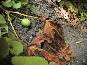 The stems grow to 30-40 cm tall, with palmately lobed leaves up to 20-30 cm diameter with 5-9 deeply cut lobes. The plant produces two growth forms. The ones with a single umbrella-like leaf do not produce any flower or fruit. The plants having a twin leaf (rarely three-leaf) structure, however, bear a single white flower 3-5 cm diameter with six (rarely up to nine) petals, between the two leaves; this matures into a yellow-greenish fruit 2-5 cm long. The plant appears in colonies in open woodlands. Individual shoots are often connected by systems of thick tubers and rhizomes. [2]