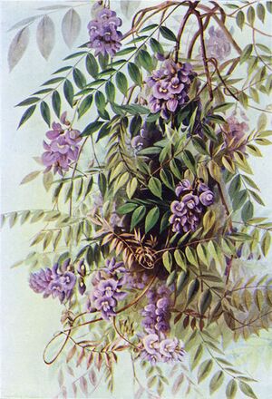 Wisteria frutescens, Poir. (Glycine frutescens, Linn. Kraunhia frutescens, Greene. Bradleia frutescens, Brit. W. speciosa, Nutt.). Tall stout climber, the trunk attaining several inches in diam.: not glandular, smoothish or somewhat downy at maturity: lfts. 4-6-7 pairs, ovate to ovate-lanceolate, acuminate but obtuse, glabrous above: racemes 4-6 in. long, densely fld.; fls. lilac-purple; auricles of the standard rather prominent; calyx-teeth very short. Low grounds, Va. to Fla. and Texas.—Sometimes planted. Var. alba, Hort., with white fls., has been listed. Var. magnifica, Herincq (W. magnifica, Hort.), supposed to belong here, has racemes 50-60-fld. and 6-8 in. long: fls. 1 in. across, lilac with a yellow spot, earlier than in the type. F.S. 11:1151.