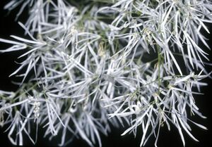 Chionanthus (Greek for snow and flower; alluding to the abundance of snow-white fls.). Oleaceae. Fringe Tree. Woody plants grown for their profusely produced white flowers. Shrubs or low trees, with deciduous, opposite and entire lvs.: fls. in loose panicles from lateral buds at the end of last year's branches, white, dioecious or only functionally dioecious; calyx 4-cleft; corolla divided nearly to the base in 4 narrow petals; stamens 2, short; ovary superior, 2-celled; style very short with a 2- lobed stigma: fr. a 1-seeded oval drupe.—Two species in E. N. Amer. and China. Ornamental shrubs, with large, dark green foliage, and very showy white fls. in early summer. The American species is almost hardy N., but requires a somewhat sheltered position; the Chinese may be more tender, but has proved hardy at the Arnold Arboretum. They thrive best in a somewhat moist and sandy loam, and in a sunny position. Prop. by seeds sown in fall or stratified; increased also by layers and by grafting under glass or budding in the open air on ash seedlings (in Europe, Fraxinus Ornus is preferred); sometimes by cuttings from forced plants in early spring. CH