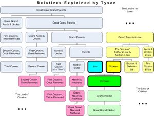 - Cousin: the most classificatory term; the children of aunts or uncles. One can further distinguish cousins by degrees of collaterality and by generation. Two persons of the same generation who share a grandparent count as "first cousins" (one degree of collaterality); if they share a great-grandparent they count as "second cousins" (two degrees of collaterality) and so on. If two persons share an ancestor, one as a grandchild and the other as a great-grandchild of that individual, then the two descendants class as "first cousins once removed" (removed by one generation); if the shared ancestor figures as the grandparent of one individual and the great-great-grandparent of the other, the individuals class as "first cousins twice removed" (removed by two generations), and so on. Similarly, if the shared ancestor figures as the great-grandparent of one person and the great-great-grandparent of the other, the individuals class as "second cousins once removed". Hence the phrase "third cousin once removed upwards".