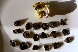 Once the seedpod has ripened and begun to split open, remove the seeds from the pod and let them dry for a few days. Most commercially sold hippeastrum have shiny black papery sheaths. If the sheaths are gently rubbed between two fingers, the actual seed can be felt as a hard inclusion slightly larger than a sesame seed. If no seed is felt, the seed may not be viable; the sheath can be opened with tweezers to confirm the presence of a seed without actually damaging it.