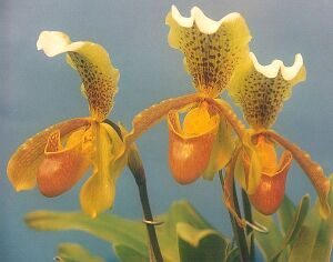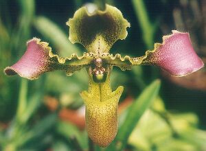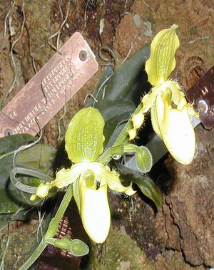 - Paphiopedilum × burbidgei (P. dayanum × P. javanicum var. virens) (Borneo).