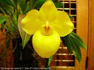 Paphiopedilum armeniacum is commonly known as the Golden Slipper Orchid. The plant size is small compared to other paphiopedilum species. The plant blooms from late fall to early spring with one flower per an inflorence.
