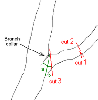 Depending on the weight of the branch, the first cut should be a notch on the underside of the branch about a third to half of the way through. The bulk of the branch should then be removed with a follow-through cut slightly above the first cut, thus leaving a limb stub. The purpose of this is to stop the weight of the branch from tearing the bark of the tree from the underside, which would normally occur if the removal was done with one cut. The limb stub ensures that any cracking of the wood resulting from the branch separation is limited to the portion of the wood to be removed. The branch collar should then be located, and can be identified by the strip of rough bark running down from the topside of the branch at its junction with the stem. The cut for removing the limb stub should be just outside the branch collar, leaving a small bump. The bump and the branch collar should not be removed since this action can reduce healing time, which could result in an infection.