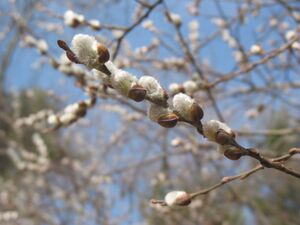 The flowers are soft silky silvery catkins, borne in early spring before the new leaves appear, with the male and female catkins on different plants (dioecious); the male catkins mature yellow at pollen release.