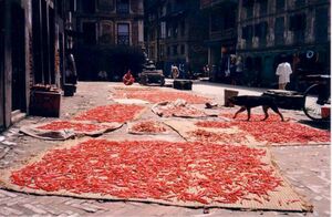 An alternate sequence for chili pepper's spread has the Portuguese picking up the pepper from Spain, and thence to India, as described by Lizzie Collingham in her book Curry.[7] The evidence provided is that the chili pepper figures heavily in the cuisine of the Goan region of India, which was the site of a Portuguese colony (e.g. Vindaloo, an Indian interpretation of a Portuguese dish). Collingham also describes the journey of chili peppers from India, through Central Asia and Turkey, to Hungary, where it became the national spice in the form of paprika.