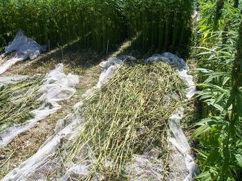 The cut hemp is laid in swathes to dry for up to four days. This was traditionally followed by retting, either water retting (the bundled hemp floats in water) or dew retting (the hemp remains on the ground and is affected by the moisture in dew moisture, and by molds and bacterial action). Modern processes use steam and machinery to separate the fibre, a process known as thermo-mechanical pulping.