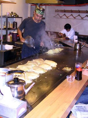 In Osaka (the largest city in the Kansai region), where the dish is said to have originated, okonomiyaki is prepared much like a pancake. The batter and other ingredients are fried on both sides on either a hot plate (teppan) or a pan using metal spatulas that are later used to slice the dish when it has finished cooking. Cooked okonomiyaki is topped with ingredients that include okonomiyaki sauce (similar to Worcestershire sauce but thicker and sweeter), nori, fish flakes, Japanese mayonnaise and ginger. When this style of okonomiyaki is served with sliced cabbage and a layer of fried noodles (either ramen or udon worked into the mix) it is called modanyaki (モダン焼き: "modern yaki"). Template:Nihongo is a thinner offshoot of okonomiyaki made with a great deal of Welsh onion.