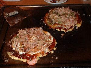 Template:Nihongo is a pan-fried Japanese dish cooked with various ingredients. Okonomi means "what you like" or "what you want", and yaki means "grilled" or "cooked" (cf. yakitori and yakisoba); thus, the name of this dish means "cook what you like, the way you like". In Japan, okonomiyaki is usually associated with the Kansai or Hiroshima areas, but is widely available throughout the country. Toppings and batters tend to vary according to region.