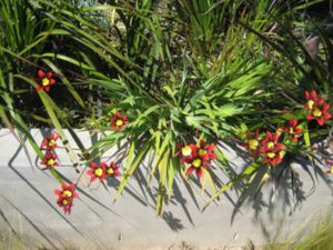 Sparaxis tricolor, also known as the Wandflower, Harlequin flower or Sparaxis, is a bulb-forming perennial plant that grows in well-drained sunny soil. It gained its name from its extremely colorful flowers which are bi or tri-coloured with a golden centre and a small ring of brown surrounded by another colour.