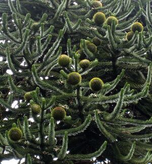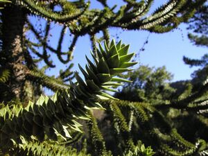 Araucaria araucana (Pehuén or Monkey-puzzle) is the hardiest species in the conifer genus Araucaria. It is native to central Chile and west central Argentina, and is an evergreen tree growing to 40 m tall and 2 m trunk diameter. It is an example of a living fossil. It is considered as the national tree of Chile.