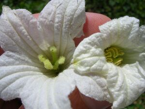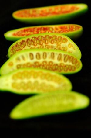 Coccinia grandis, also called tindora (tindori, tindoori), giloda, kundri, kundru, kowai, kovai, tindla, gentleman's toes (compare lady's fingers), thainli or ivy gourd, is a tropical vine grown for its small edible fruits. They may be eaten immature and green, or mature and deep red. The young shoots and leaves may also be eaten as greens.