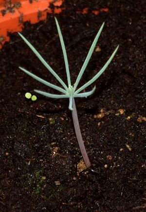 Gymnosperm seedlings also have cotyledons, and these are often variable in number (multicotyledonous), with from 2 to 24 cotyledons forming a whorl at the top of the hypocotyl (the embryonic stem) surrounding the plumule. Within each species, there is often still some variation in cotyledon numbers, e.g. Monterey Pine (Pinus radiata) seedlings have 5â9, and Jeffrey Pine (Pinus jeffreyi) 7â13 (Mirov 1967), but other species are more fixed, with e.g. Mediterranean Cypress always having just two cotyledons. The highest number reported is for Big-cone Pinyon (Pinus maximartinezii), with 24 (Farjon & Styles 1997).