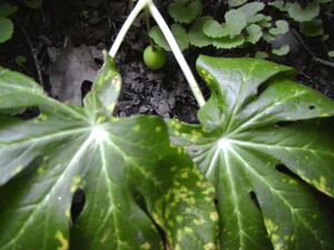 The stems grow to 30-40 cm tall, with palmately lobed leaves up to 20-30 cm diameter with 5-9 deeply cut lobes. The plant produces two growth forms. The ones with a single umbrella-like leaf do not produce any flower or fruit. The plants having a twin leaf (rarely three-leaf) structure, however, bear a single white flower 3-5 cm diameter with six (rarely up to nine) petals, between the two leaves; this matures into a yellow-greenish fruit 2-5 cm long. The plant appears in colonies in open woodlands. Individual shoots are often connected by systems of thick tubers and rhizomes. [2]