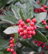 It is grown as an ornamental plant for the attractive bright red berries set against the glossy green leaves. Its original range was close to the coast, but the range has been extended by planting.