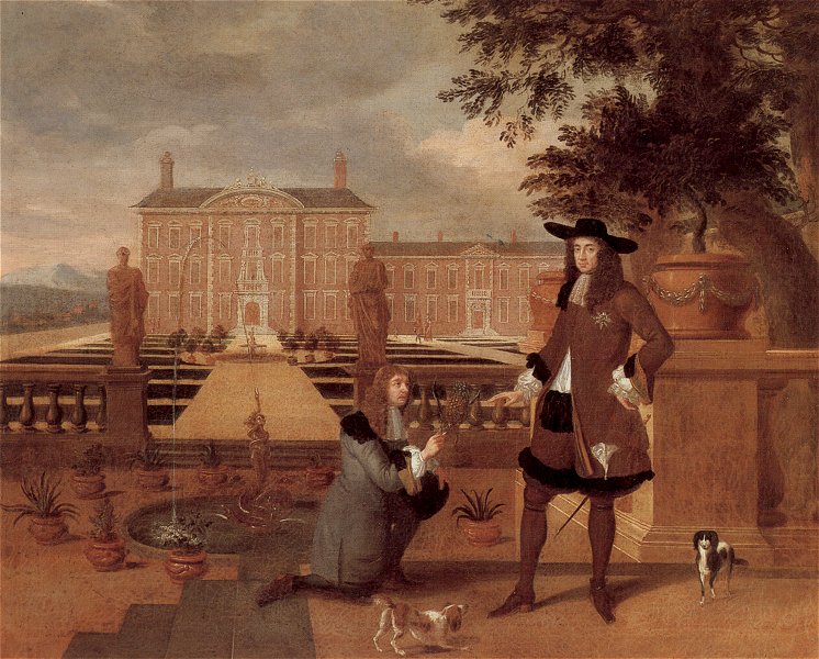 A painting by Hendrik Danckerts from 1675 showing Charles II of England being given the first pineapple grown in England by his royal gardener, John Rose.