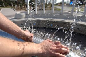 A splash fountain or bathing fountain is a fountain intended for people to cool off in. Although many fountains were not designed as bathing fountains, children of all ages often use them for that purpose. Some fountains are fenced in, or have raised edges as a barricade to keep people out. In other situations, fountains are designed to allow easy access, and feature nonslip surfaces, so that people can safely use them to cool off in on hot summer days.