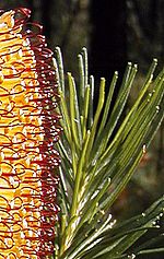 Known as the Hill Banksia, it was first published as Banksia collina by Robert Brown in 1810, and retained species rank until 1981, when George demoted it to a variety of B. spinulosa.[14][15] It differs from B. spinulosa var. spinulosa in having broader leaves 3–8 mm in width that have serrate margins. The leaf undersides have more prominent venation.[13] Its flower spikes are usually gold, or sometimes gold with red styles, especially in New South Wales. It is found in inland gorges and tablelands such as Carnarvon Gorge, Expedition National Park, Isla Gorge and Dicks Tableland in a remote part of Eungella National Park, in Central Queensland but coastal on the New South Wales Central- and north coast.[11][16]