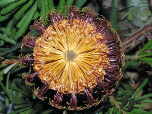 Regular pruning is important to give the plant an attractive habit and prevent it from becoming leggy. As most cultivated forms of this species have a lignotuber, dormant buds exist below the bark that respond to pruning or fire, and hard-pruning is possible almost to ground level as a plant can readily sprout from old wood.[5] This is not the case for var. cunninghamii which should not be pruned below foliage.[6] Flowering may take up to eight years from germination; buying an advanced plant may hasten this process, as will getting a cutting-grown plant. Banksia spinulosa can be propagated easily by seed, and is one of the (relatively) easier banksias to propagate by cutting.[7] Named cultivars are by necessity propagated by cuttings as this ensures that the plant produced bears the same attributes as the original plant.[8]