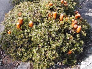 Both B. s. var. collina and var. spinulosa are commonly seen in nurseries; given that the varieties can hybridise, attempting to find a local provenance form from a local community nursery, Bushcare or Australian Plants Society group is preferable environmentally if they are intended for planting in gardens near bushland where native populations occur. There are some dwarf forms available for the city gardener – 'Stumpy Gold' is a form of variety collina originally from the Central Coast, while 'Birthday Candles', 'Coastal Cushion' and 'Golden Cascade' are forms of variety spinulosa from the South Coast of New South Wales.[9]