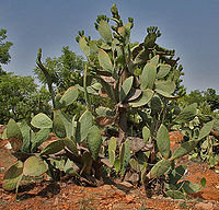 Opuntia ficus-indica (Indian Fig Opuntia or barbary fig) is a species of cactus and a long-domesticated crop plant important in agricultural economies throughout arid and semiarid parts of the world. A common English name for the plant and its fruit, is the prickly pear, although this common name has also been applied to other less common Opuntia species.
