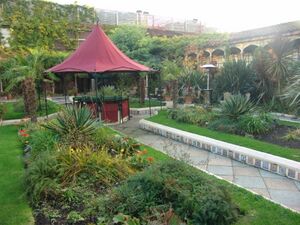 Kensington Roof Gardens (formerly known as Derry and Toms Roof Gardens) is a roof garden covering 6,000 m² (1.5 acres) of the top of the Derry and Toms building on Kensington High Street, in central London, near Kensington Gardens. The gardens, surrounding a large restaurant, are situated 30 metres above street level and provide a panoramic view over west London on a clear day.