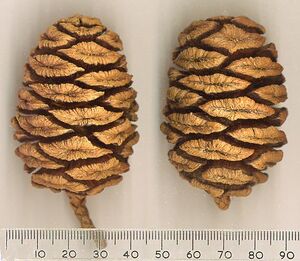 Giant Sequoias are the world's largest trees in terms of total volume (technically, only 7 living Giant Sequoia exceed the 42500 cuft m3 of the Lost Monarch Coast Redwood tree; see Largest trees). They grow to an average height of 50–85 m (165–280 ft) and 6–8 m (18–24 ft) in diameter. Record trees have been measured to be 94.8 m (311 ft) in height and 17 m (57 ft) in diameter.[1] The oldest known Giant Sequoia based on ring count is 3,500 years old. Sequoia bark is fibrous, furrowed, and may be 90 cm (3 ft) thick at the base of the columnar trunk. It provides significant fire protection for the trees. The leaves are evergreen, awl-shaped, 3–6 mm long, and arranged spirally on the shoots. The seed cones are 4–7 cm long and mature in 18–20 months, though they typically remain green and closed for up to 20 years; each cone has 30-50 spirally arranged scales, with several seeds on each scale giving an average of 230 seeds per cone. The seed is dark brown, 4–5 mm long and 1 mm broad, with a 1 mm wide yellow-brown wing along each side. Some seed is shed when the cone scales shrink during hot weather in late summer, but most seeds are liberated when the cone dries from fire heat or is damaged by insects (see Ecology, below).