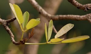 They are large shrubs or trees growing to 5 to 50 m (16 to 160 ft.) tall depending on the species; many species are dry-season deciduous but some are evergreen. The leaves are opposite pairs, complex or palmately compound with 3–7 leaflets.[1]